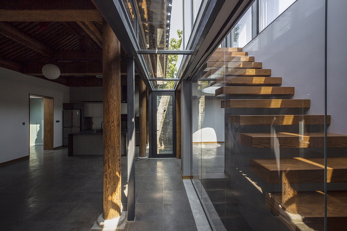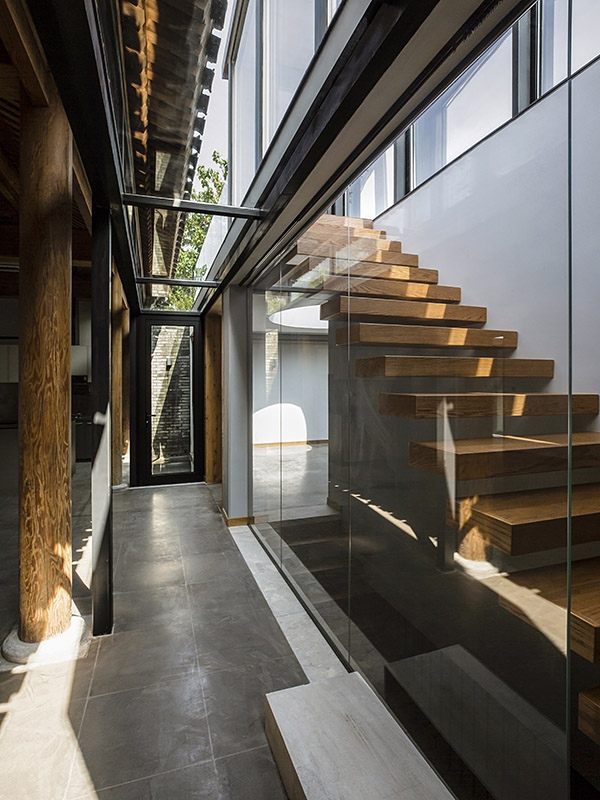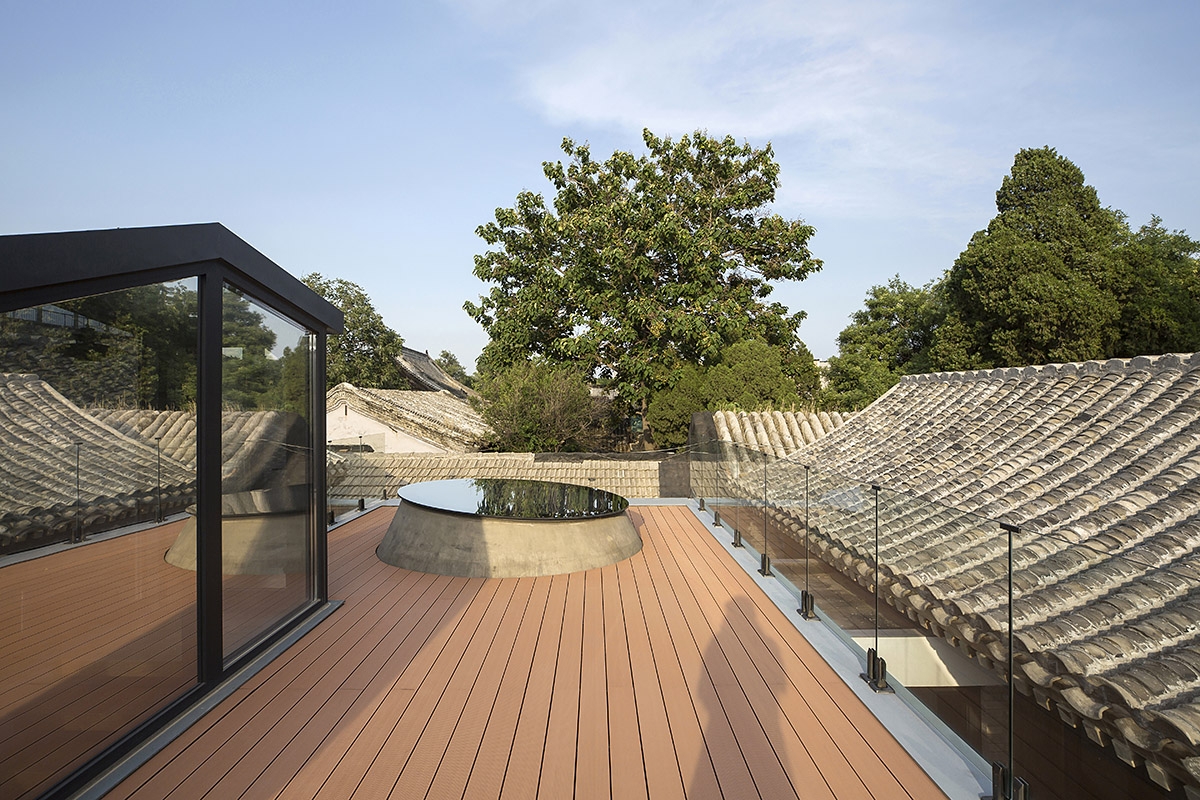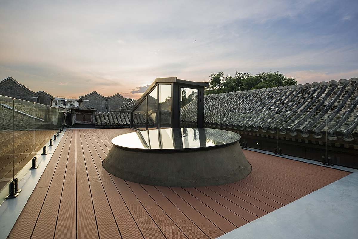 平房屋顶低于南北房屋檐,使充足的光线能够从房屋的间隙进入室内。玻璃楼梯间的最高点控制在北房屋脊线以下。屋顶露台替代了平房占据的户外空间,成为一个抬高的庭院,可以一览胡同里高低起伏的屋顶景观。(平房下方还拓展了地下空间,用作家庭活动室,通过北房东侧小庭院内的天窗采光。)