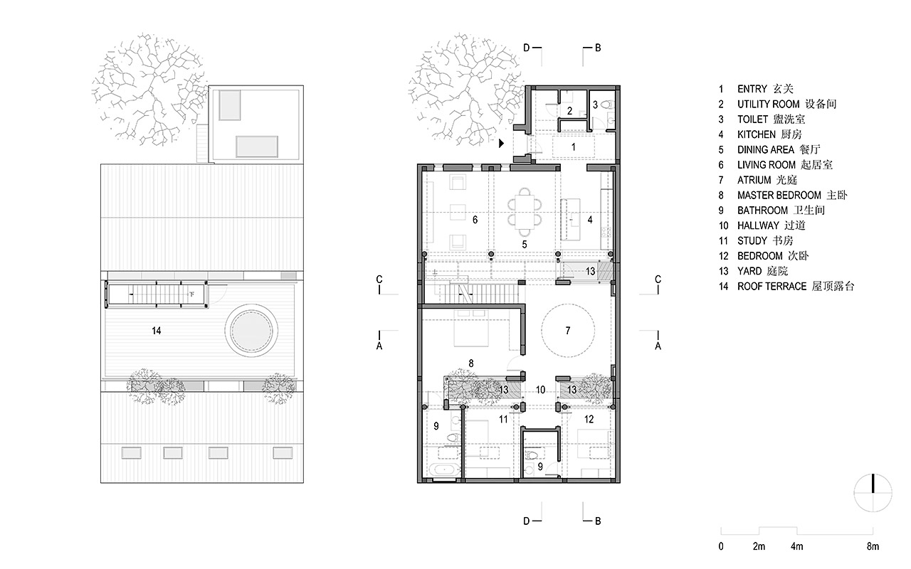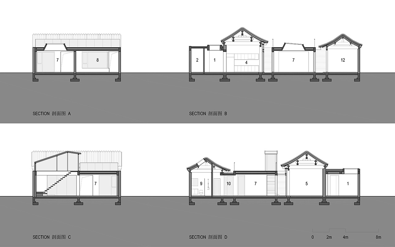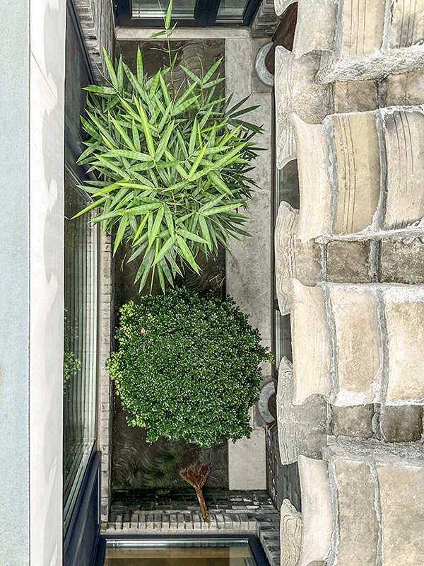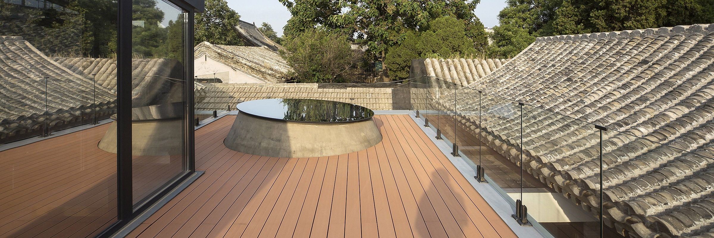 平房屋顶低于南北房屋檐,使充足的光线能够从房屋的间隙进入室内。玻璃楼梯间的最高点控制在北房屋脊线以下。屋顶露台替代了平房占据的户外空间,成为一个抬高的庭院,可以一览胡同里高低起伏的屋顶景观。(平房下方还拓展了地下空间,用作家庭活动室,通过北房东侧小庭院内的天窗采光。)