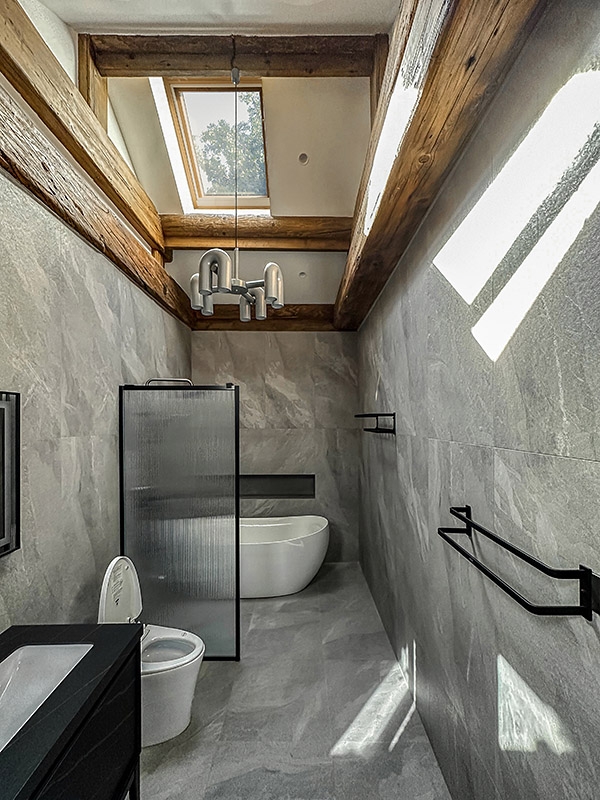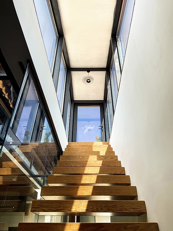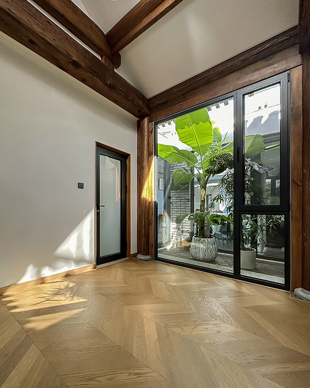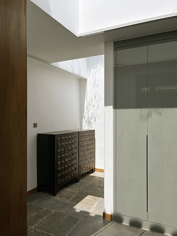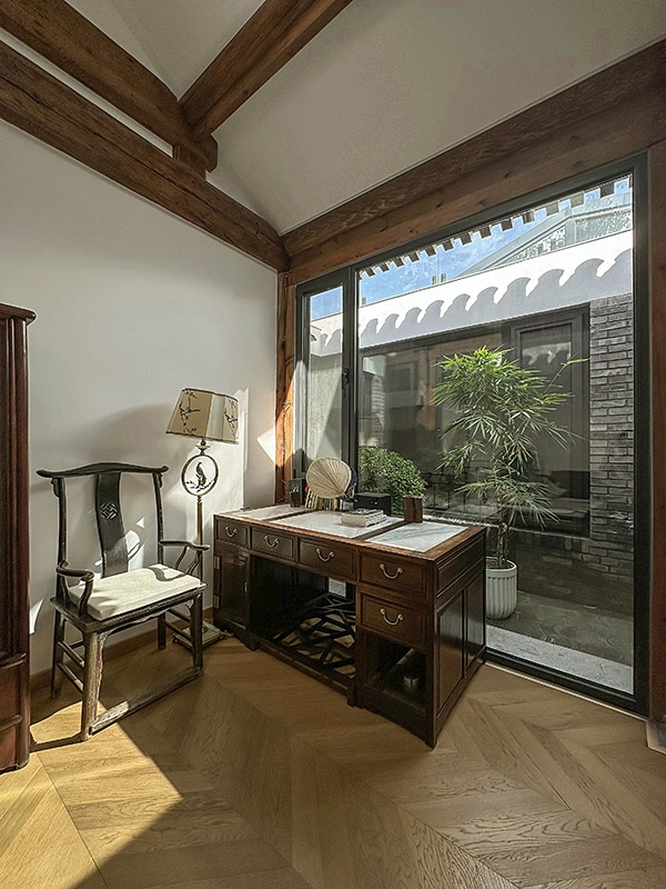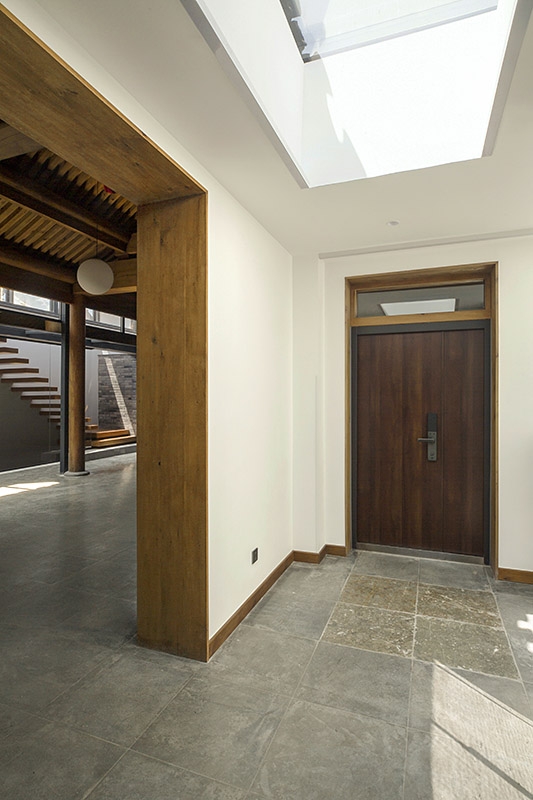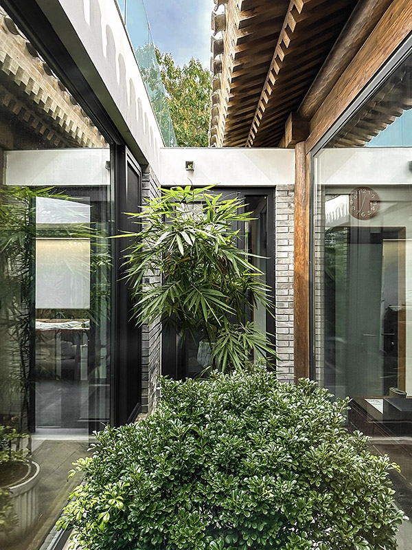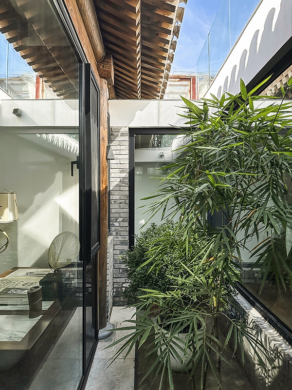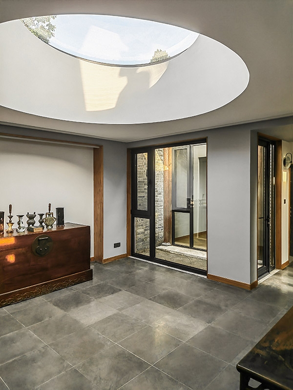 小庭院周围的断桥铝落地门窗、北房朝向胡同的北墙上的电致变色玻璃竖窗、玄关和南房的南向屋顶上的一系列天窗,最大限度地增加了室内的采光。