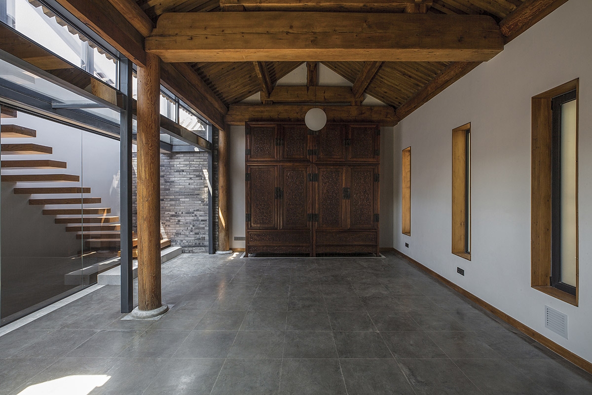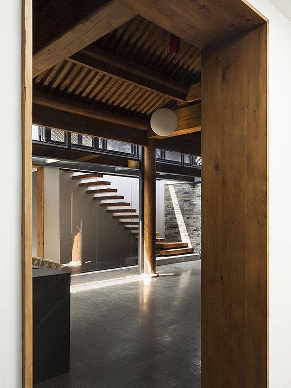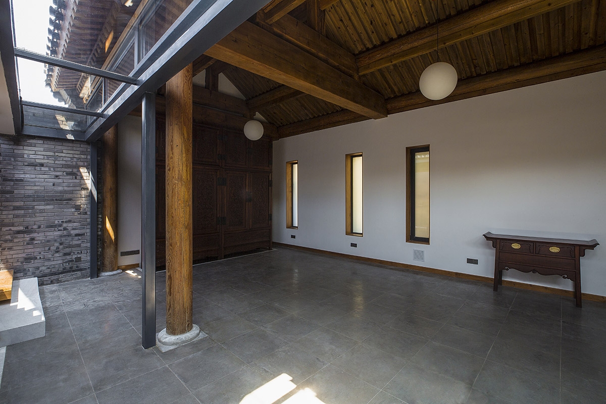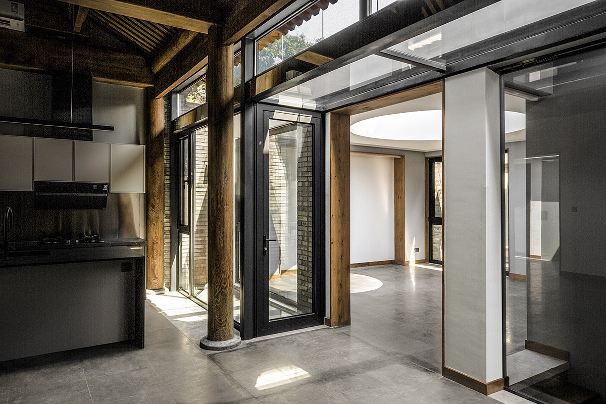 设计重组了院落空间:北房、东房、西房的不对称布局转变为三个互相平行的体量。北房原为不规则的三开间平面,采用木桁架结构,拆除后以房主从其它院落回收的传统木梁柱结构重建。东房老屋的三开间¬¬木梁柱结构被保留下来,落架后移位重修成为南房,并向西增补一个开间。南北房之间新建“平房”,取代原来的西房,东侧有圆形的大天窗,光线倾泻而入,如同一个室内的庭院。