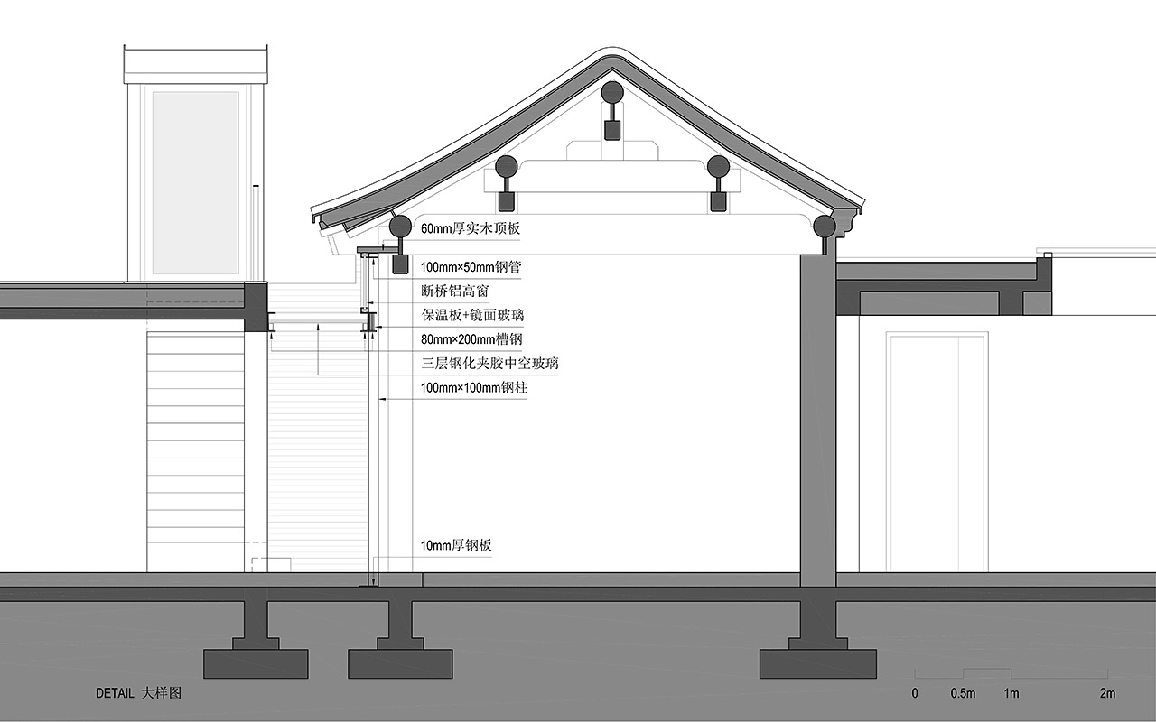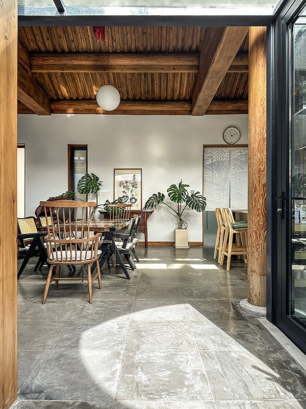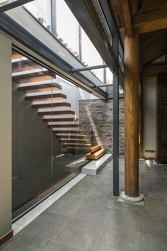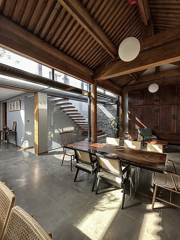 院内房屋以传统木结构(南北房)与砖混结构(平房)相结合。北房南侧的“幕墙”门窗及玻璃屋顶采用独立于木梁柱的钢结构,槽钢横梁的凹槽内安装镜面玻璃,反射室内空间,在视觉上减轻了结构的重量。