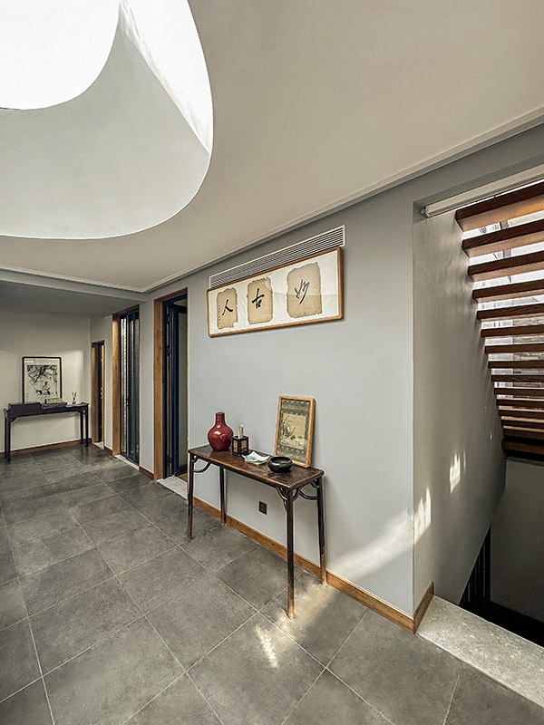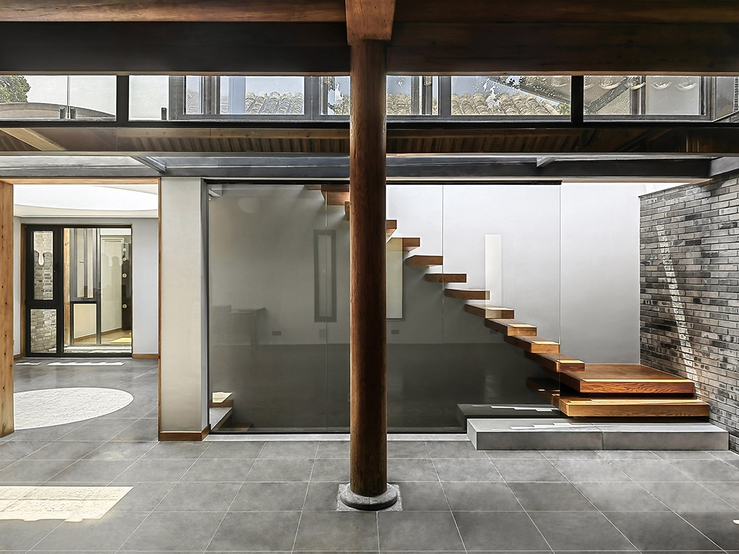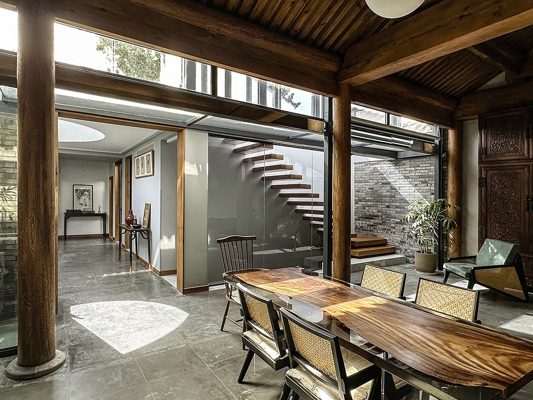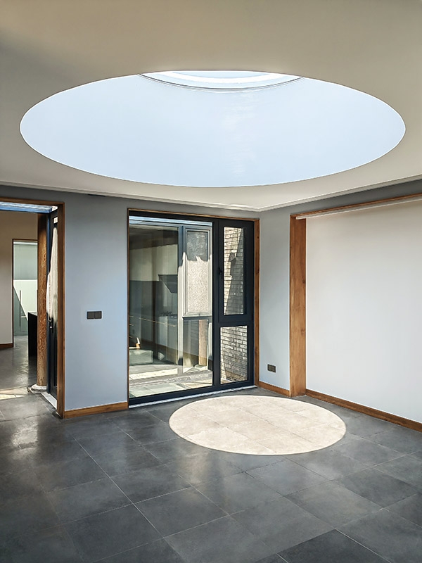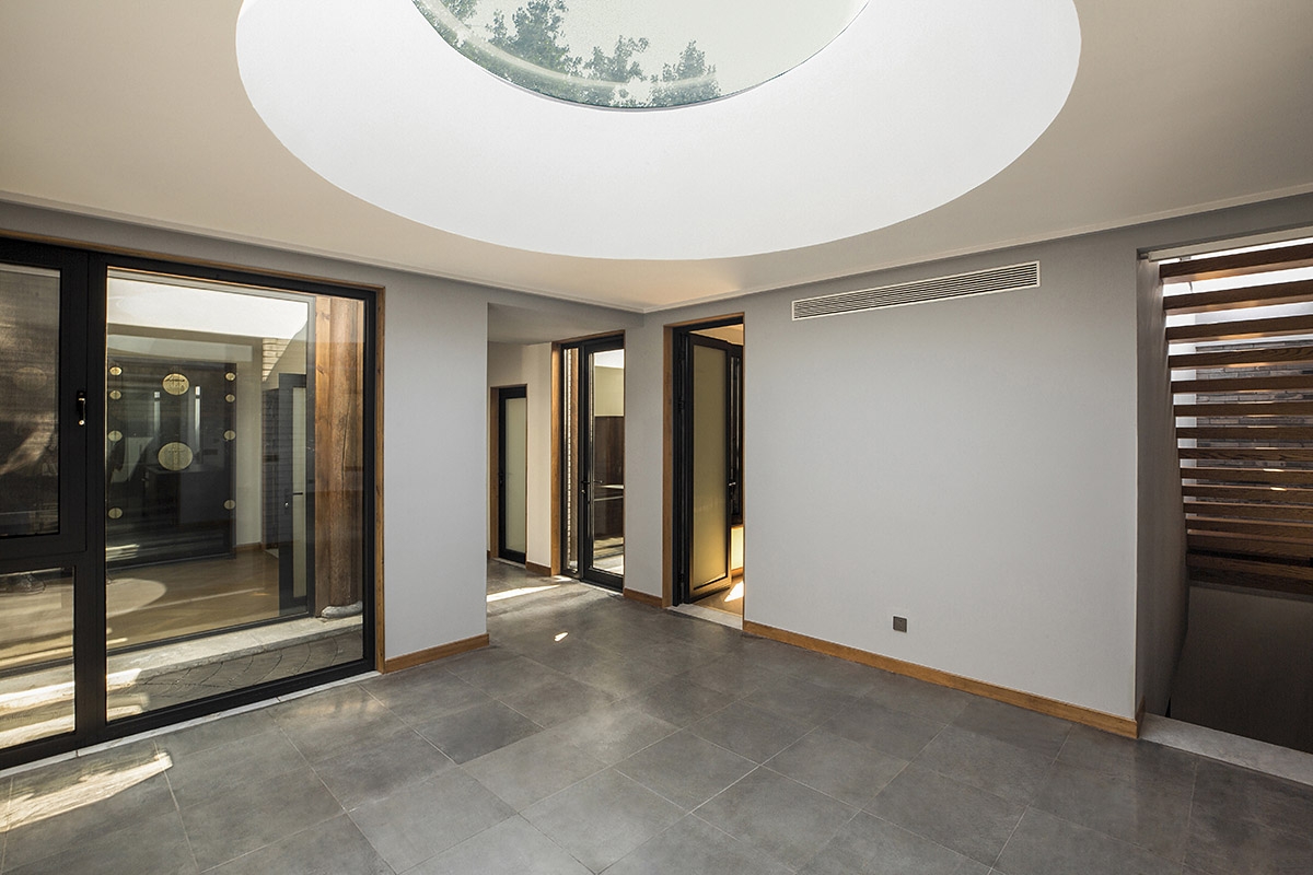 院落一层形成流动的室内空间:东北角门房仍是入户玄关及辅助空间;北房是开放式厨房、餐厅和起居室;卧室、书房及卫生间位于平房西侧和南房;平房东侧圆形天窗下的“光庭”与户外庭院相邻,南北通透,成为日常起居生活的枢纽。