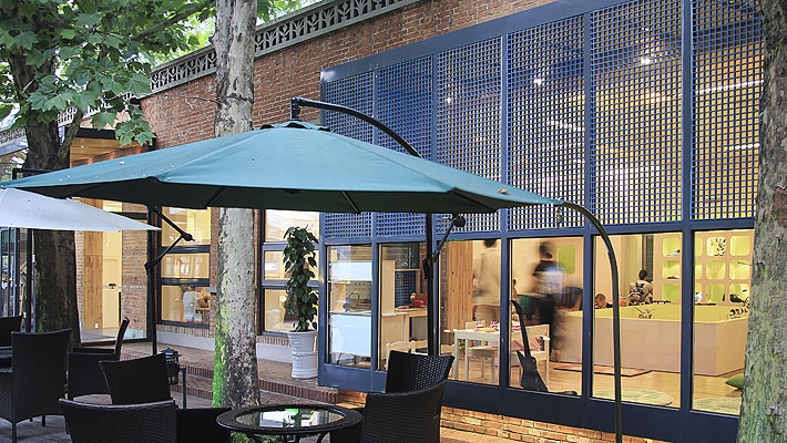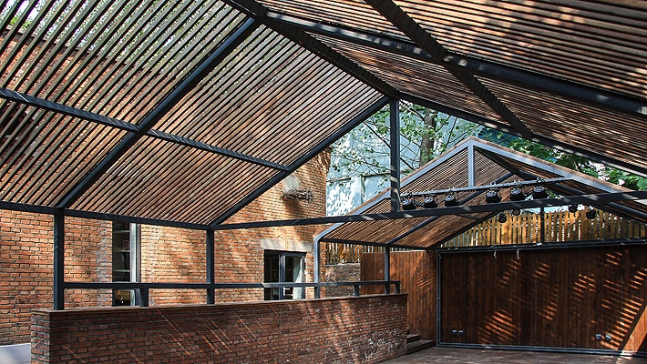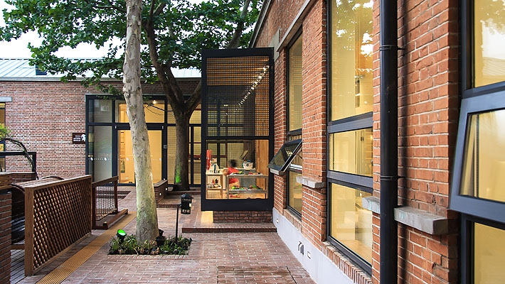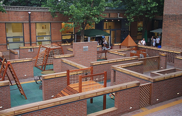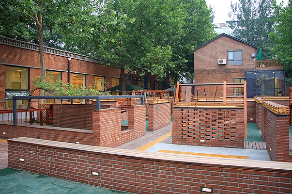 淘乐思幼儿园红院子改建自一组L形布局、砖混构造的平房,周边环绕着高大的梧桐和杨树。原来是一个小型工厂,建筑的维护状态很差,狭小的窗户使内部的采光不足,与L形建筑所形成的院落在视线上的联系很受限制。业主希望我们把它改建成淘乐思幼儿园的幼教中心。虽然是一幅破旧失修的景象,现场同时也蕴涵着令人触动的因素。L形建筑与一系列大小不等的庭园所构成的户外空间相互交织,就连重复性的窗洞也呈现出一种简单而优美的韵律,而砖这种材料又为之增添了细腻丰富的感觉。我们从中意识到有机会重新植入一个新的内部空间,并重建室内外的联系,使之产生更多的互动。