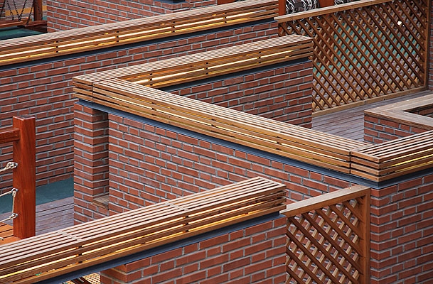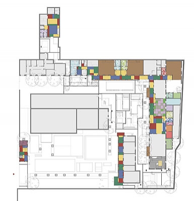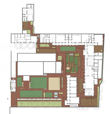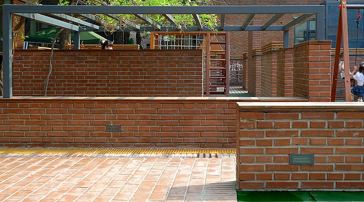 户外空间重新组织成一系列的有主题的庭院,其中比较重要的是儿童的迷宫和剧场。户外场所使用的材料主要是砖、木材和钢,来传承现场的场所属性。我们相信它们能够潜移潜移默化地向孩子传达那种时间的厚度和世界的真实性。
