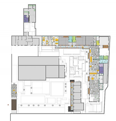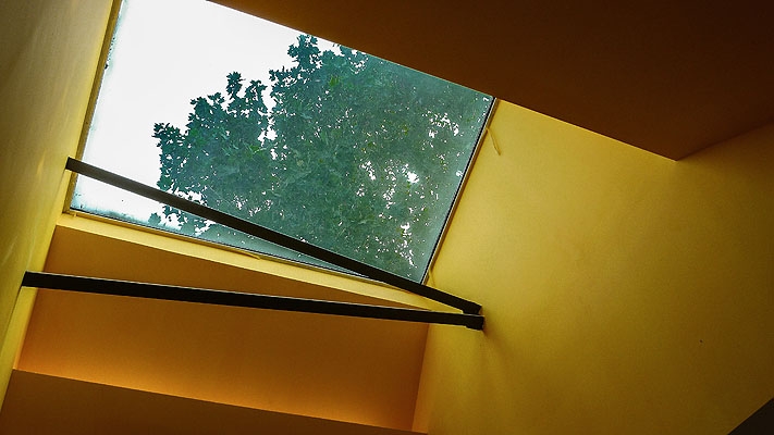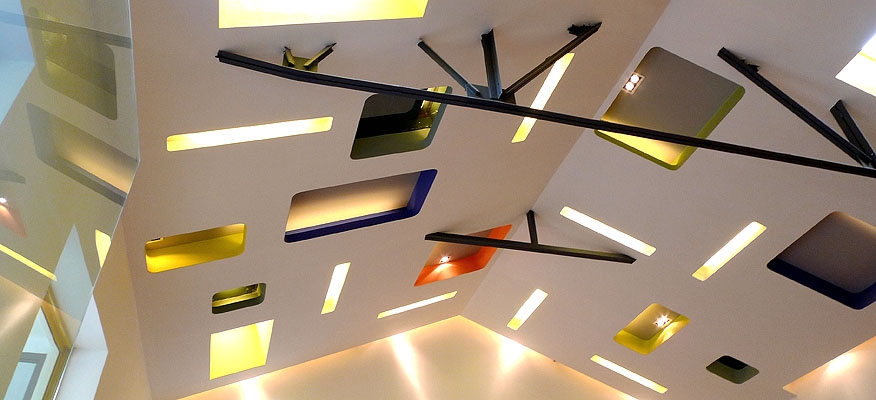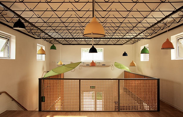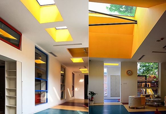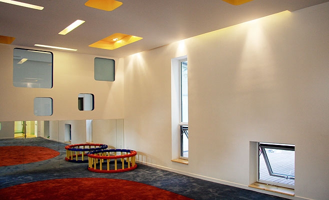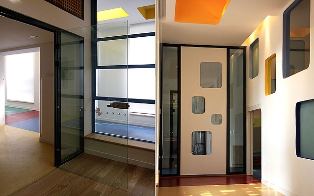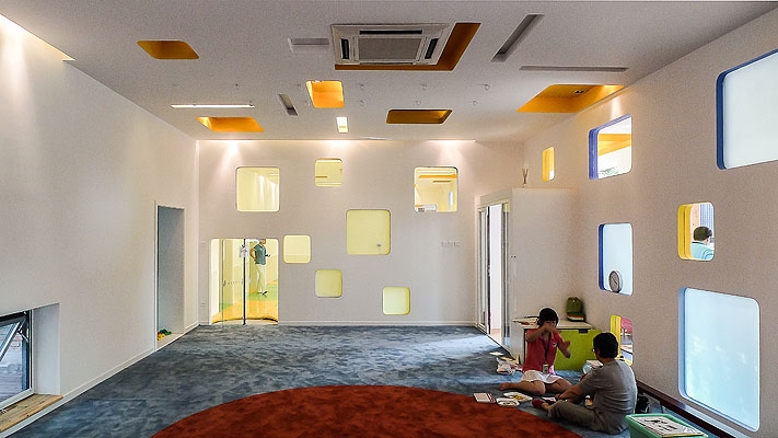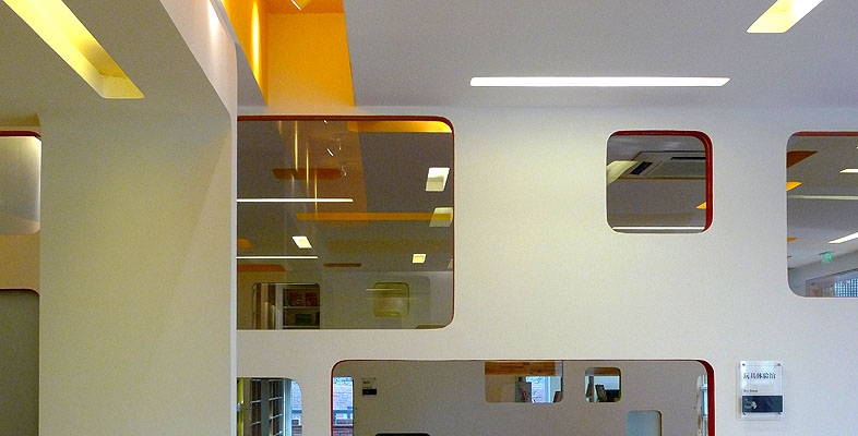 尽管室内空间的功能各种各样,而设计必须满足功能性的需求,我们一直寻求在空间之间建立起一种更本质的联系。在室内隔墙、天花以及夹层楼板开出来不同尺寸的洞口,演绎出窗、门和天窗,再嵌入透明或半透明的玻璃或深色的镜面。外墙上的窗被扩展到更低的标高,与孩子的身高相匹配。其中的两个被加到更大的尺寸并凸出去,变成阅读或群体游戏的空间。建筑,以及内部的房间变得具有视线和光线上的穿透性。洞口的侧边涂以多种颜色,来把室内渲染得更加富于色彩,这种效果因为玻璃和镜面的反射演化得更加复杂。