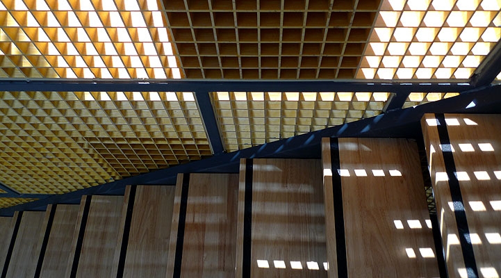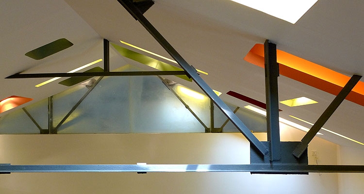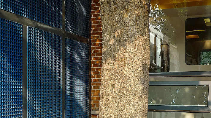 建筑的现状作为时间的记录被小心地对待,特别是承重砖墙和钢结构桁架。我们把它们和新添加的元素混合起来,而没有试图去隐藏。桁架的杆件从巨大的天窗中间穿过本身就非常诗意。对现有建筑最大的动作是在北侧加建了一条宽敞的走廊,以便能达到教室面积的规定。新的北立面遵循了东侧立面的形式规则。