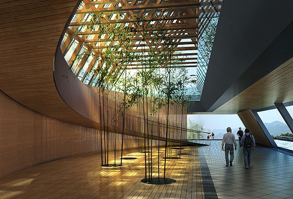 凤凰山峰顶建筑位于浙江省的竹乡安吉。作为城市的标志性景观建筑,设计的主旨在于重新塑造中国江南的地方精神。于主峰与次峰之间形成主次完整丰富,节奏轻重有致的景观经验:阁、栈道、桥、廊、台、亭等空间序列像一幅长卷渐次展开。建筑形式在时代精神与中国传统建筑文化之间寻求平衡,在外部型体、内部空间、结构形式以及构造细部方面保持着简练、清晰的现代设计逻辑;同时在这些层面上寻求诠释中国传统建筑与自然和谐共生的关系以及细腻优雅的构造品质。