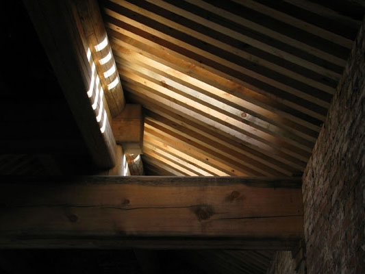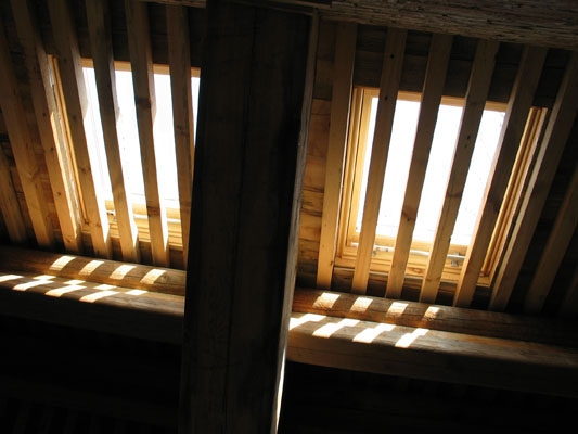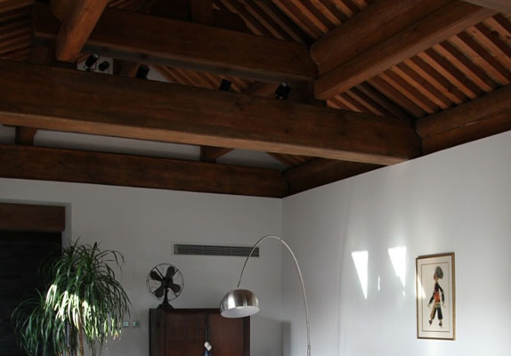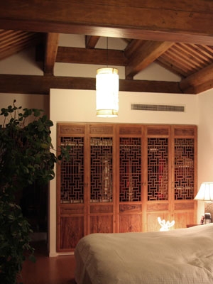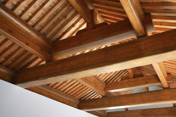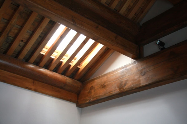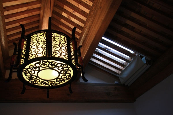 室内空间以暴露的原色木结构为特色,配以简洁的白色墙面,地面则根据不同房间的特点分别选用金砖、黑石板、木地板、瓷砖、水泥自流平等多种材质。空调、新风、地暖以及太阳能热水系统的引入提供了现代生活的舒适性。为了改善传统建筑构造的物理性能,外墙和屋顶增加了保温层,并且选用带双层中空玻璃的断桥铝合金门窗取代传统木门窗。