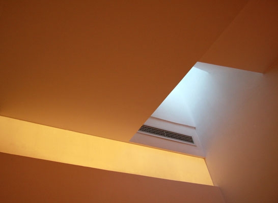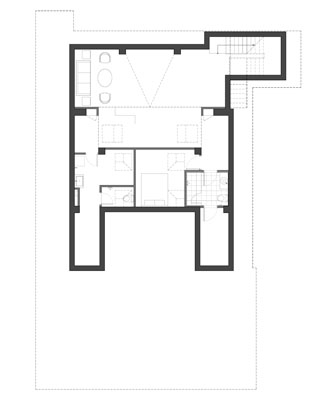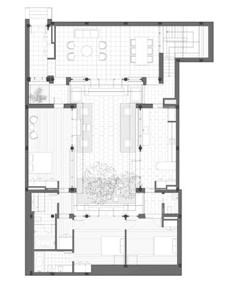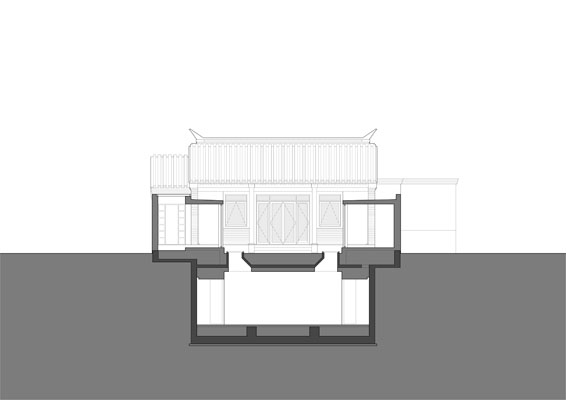 当代家居生活的需要决定了这一四合院改造项目在空间、结构、技术和审美上都必然是传统与现代元素相结合。位于西北角的入口门廊正对着天窗下的小院。作为四合院正厅的北房是起居室和餐厅。主卧室被安排在西厢房,以获得早晨的阳光。与之相对的东厢房成为了厨房,爱好烹饪的主人可以在这里享受傍晚的阳光。南房通常不见阳光,但由于在朝南的瓦屋顶上设置了天窗,阳光穿过椽子之间的空隙倾泻而入,使次卧室和书房变得更加明亮。卫生间集中在房子的西南角,与它们在传统四合院里的位置一致。与传统四合院不同的是,南、北房及东、西厢房之间以金属/玻璃屋顶的过道串连在一起,形成连续的环形室内空间——四合院里的生活围绕着中间的庭院展开。庭院内的一组六个小天窗以及东北角楼梯间上方的大天窗给地下的家庭活动室和辅助用房带入了充足的自然光线。