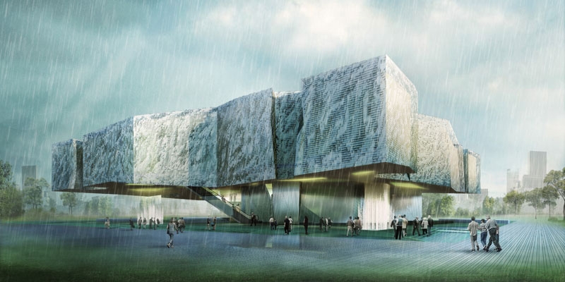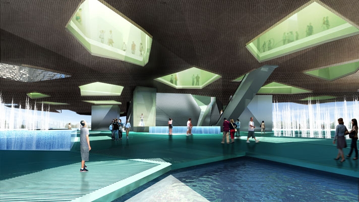 人们从四面八方来到“树”下,没有大门或墙面的阻隔,可以自由穿越、停留;“树冠”所带来的荫翳、空气的对流、水景的降温效应在上海炎热的夏天里创造了宜人的“微气候”;广场的透空钢格栅地面悬浮于水面之上,溢水池、水墙、喷泉点缀其中,不仅带来了水的光影和声响,同时带走了空气中的热量,调节着环境的湿度;木质活动平台既可以用作休息座椅或桌子,也可以发生公共活动或即兴表演;阳光从二层的孔洞倾斜而下,随着天气的变化给底层空间渲染出各种不同的氛围;从孔洞仰望天空,就如同透过照相机的镜头,天空会显得纯净而富有诗意,不管那是一片深蓝还是一片乌云;整个一层天花是连续的LED屏幕,当夜色降临,声音伴随着图像开始观众期盼已久的演出,将一天的活动推向高潮。