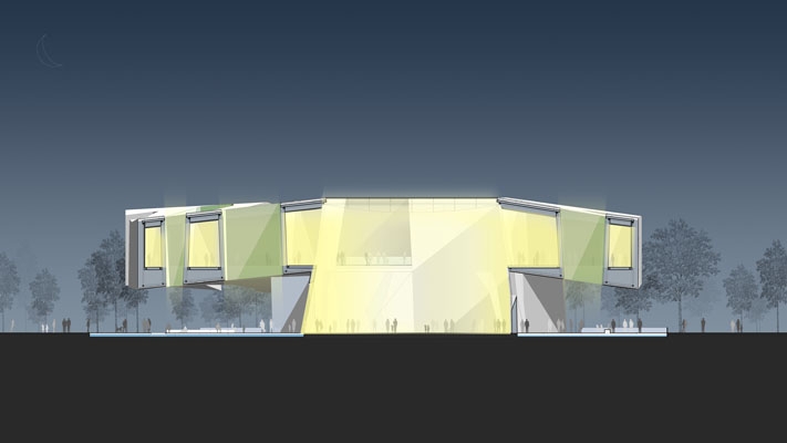 主题展厅位于地面层的“树干”之中,两层通高的空间成为广场的视觉焦点,并将参观者带离地面,进入“枝叶”;二层展厅如同一张四通八达的网络,没有展室与走廊的明确区分,形成叶脉般的参观路径,对精读、泛读有不同需求的观众可以自由选择;建筑物的结构采用轻质的整体性受力体系,墙面则采用薄膜和织物构造,外面悬挂着一层由金属叶片制作的表皮,如轻盈的树叶一般随风飘动...