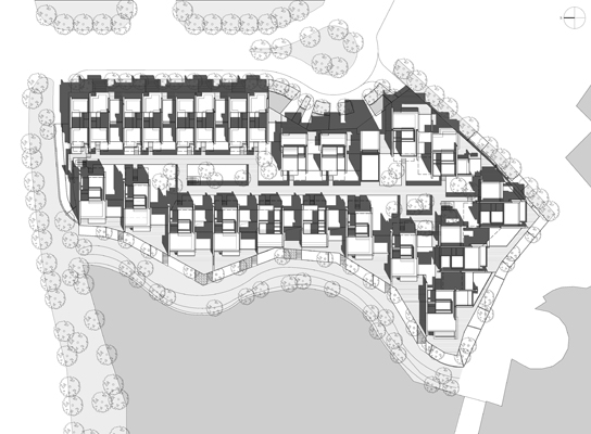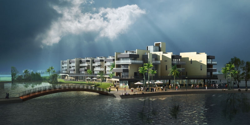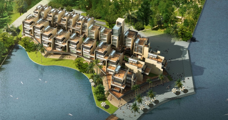 整个项目的布局与基地环境密切相关。北侧衔接城市交通;东侧毗邻另一居住社区,双拼户型单元与标志塔即在这一边,结合底层连续性的商业空间形成都市生活气氛;西侧及南侧临湖,布置独栋户型单元,湖景渗透到建筑体的内部;中间部分为公共性的景观内院。