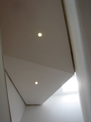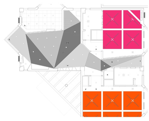 二层公共活动区的天花是一张折叠起伏的‘纸板’