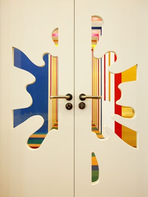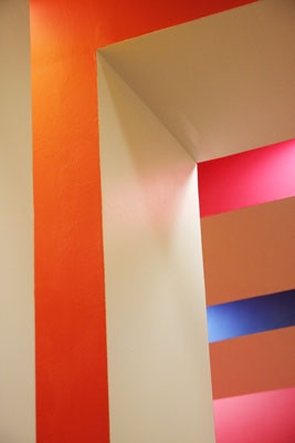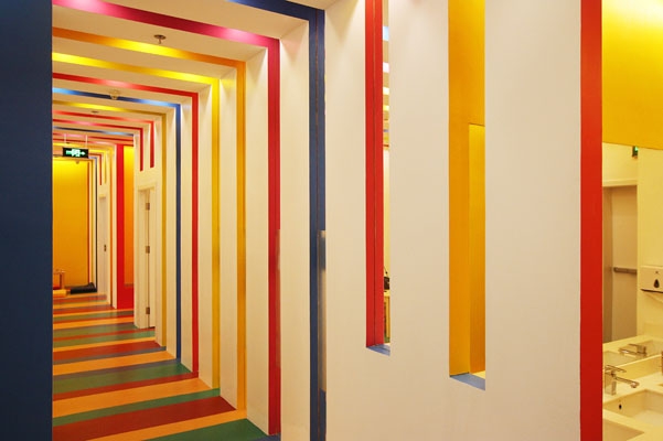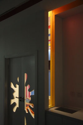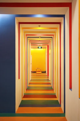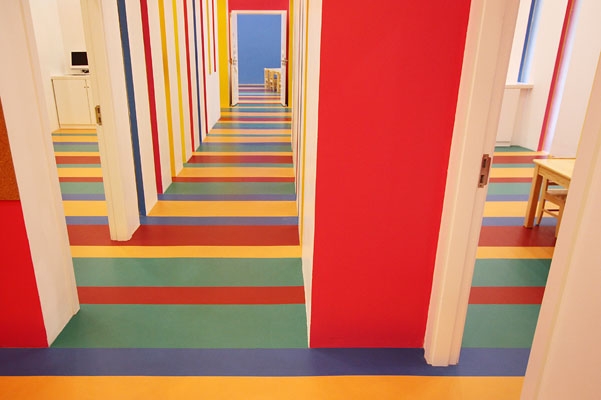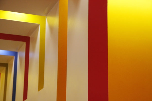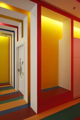 面向外廊的竖墙分别刷上洋红、黄、蓝三种颜色,颜色沿着竖墙和天花凹槽的侧边向室内延伸,在纵墙上扩展为从地面到天花的色面。随机排列组合的色彩给原本理性严谨的空间结构增添了感性和变幻的一面。在光线的照射下,互相平行的色面反射叠加,又衍生出不同程度的橙、绿、紫的偏色。条带状的彩色橡胶地面从一个房间穿入到另一个房间,打破了空间的边界,并与墙面、天花的色边一同勾勒出层层嵌套的景框,如同一系列空间的切片,使空间的纵深感加强,营造出色彩缤纷的氛围。