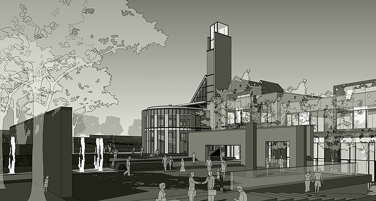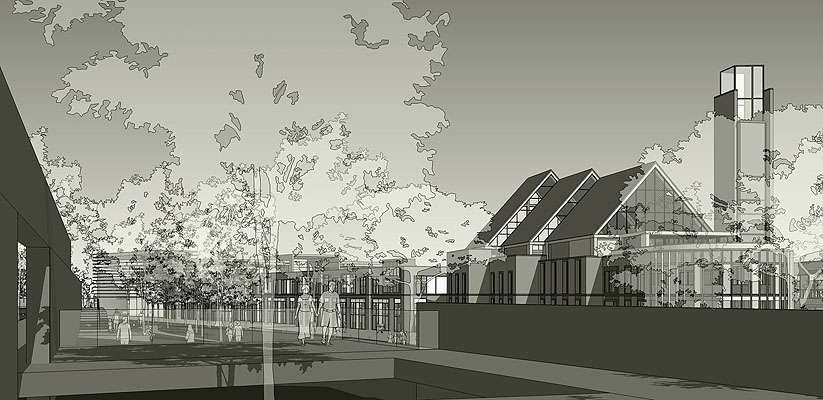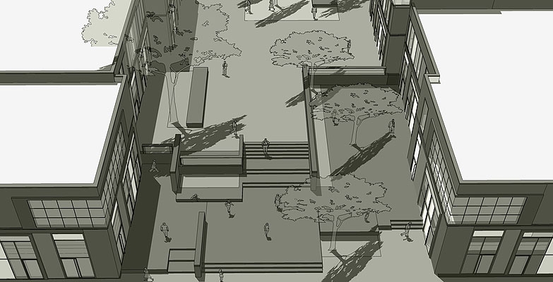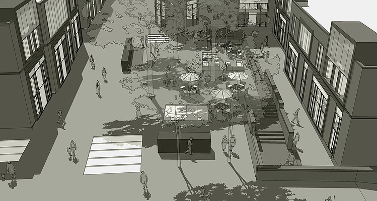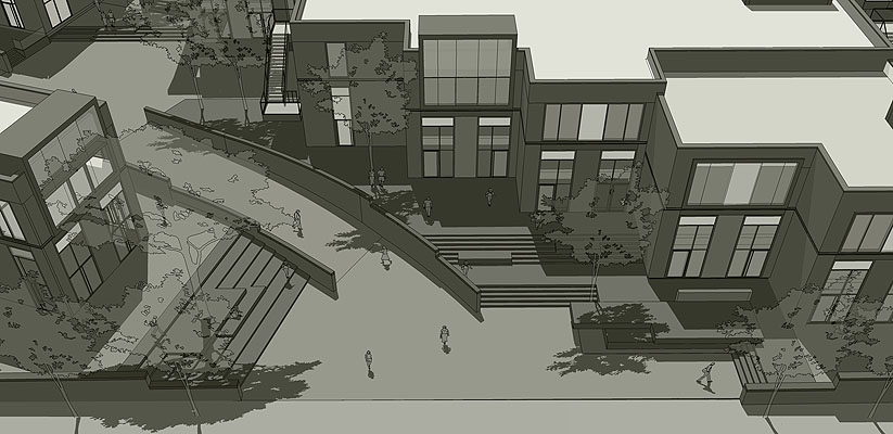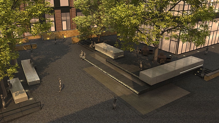 仅管在街区与广场的形态上参考了欧洲城镇,景观设计在形式设计层面完全回避具体手法的模仿,而是回归到对空间围合形态,自然元素的组织运用例如阳光、树荫、泉水,建筑构造与照明和标识等基本设计细节的关注;景观设计在这里对与人的行为方式之间不是规定,而是合作。
