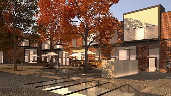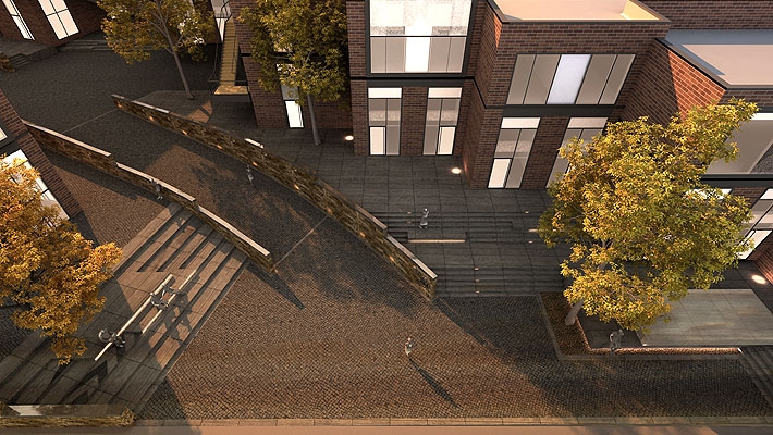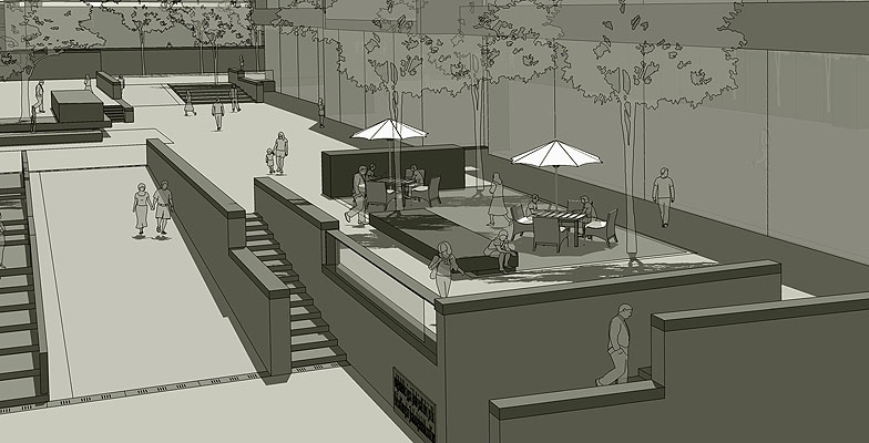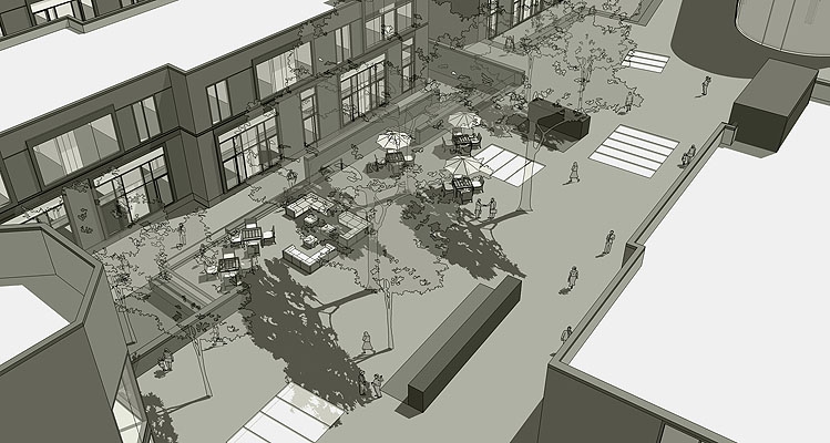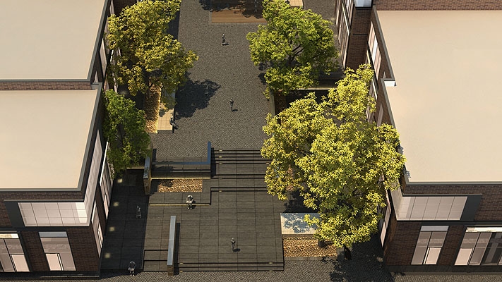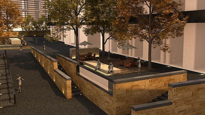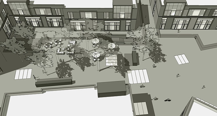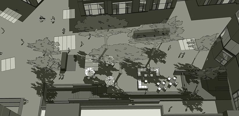 从空间的类型来说,未来城有些接近传统欧洲小镇的街区形态,建筑的密度很高,网络状的街道路径只留下了少量比较开阔的广场,有些在入口位置,有些在街区中间。这种情形促使我们采取像真实的历史城镇一样的方式来对待这些广场,希望使其产生良好的公众亲和力,如同街道之间小块的绿洲或者城市中的客厅,能够吸引并容纳购物人群的停留休息。所以,就设计理解来说,景观不是广场的主体元素,人才是;景观是承载人的活动而发生的舞台及背景。空间场景追求朴素真实以及高质量的构造完成度,避免商业街区容易出现的拼贴式的混杂状态,希望给商业街区注入更加自然真实的城市环境品质。