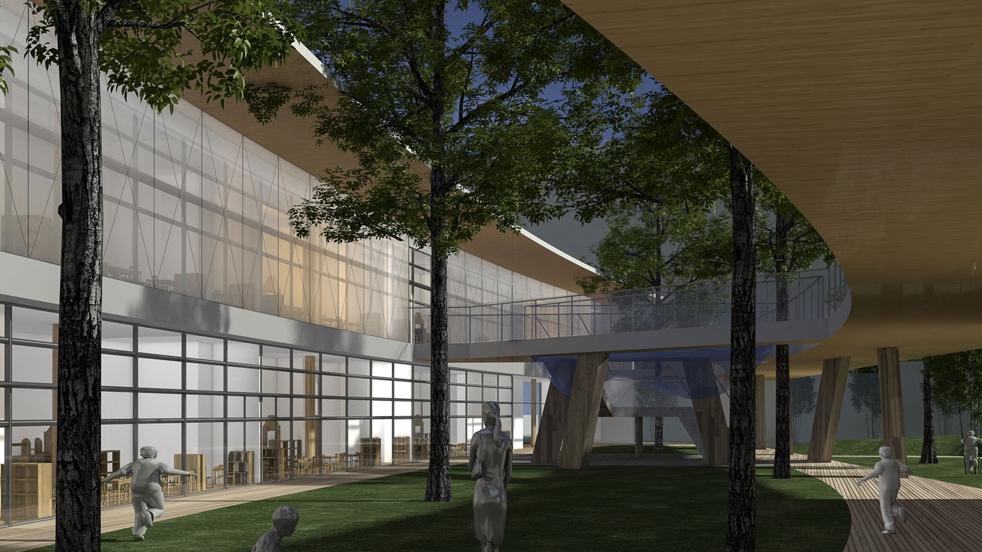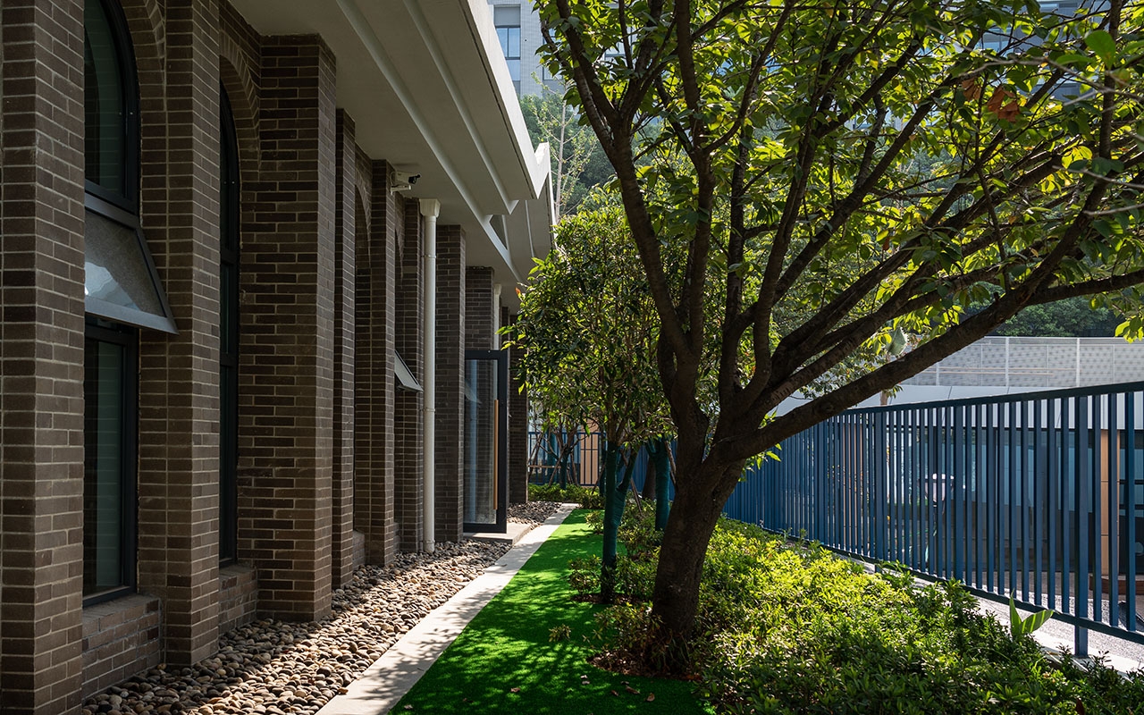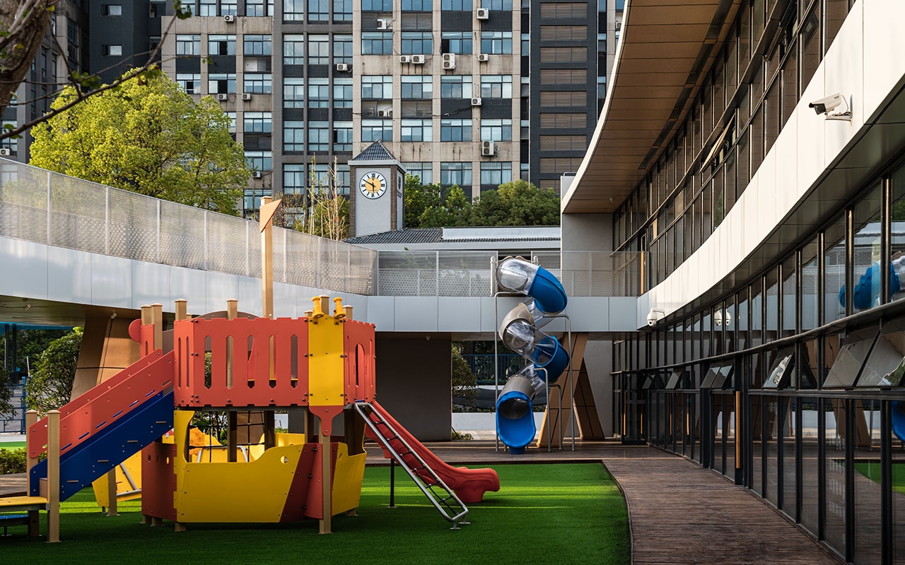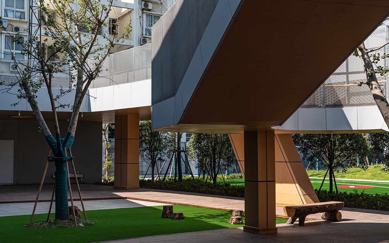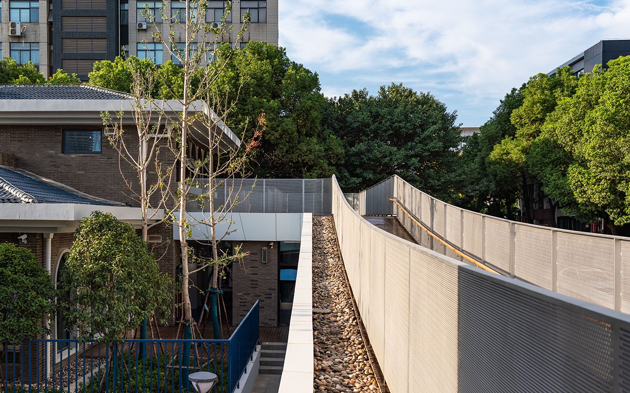 户外栈桥形成树干分杈形状的空中路径,有分枝延伸到地面,兼作户外玩教具的挂载平台。栈桥在地面层形成开放的外廊空间,顺带起到了遮阳挡雨的作用,在武汉炎热多雨的气候条件下,户外场地的利用率和舒适度大为提高。