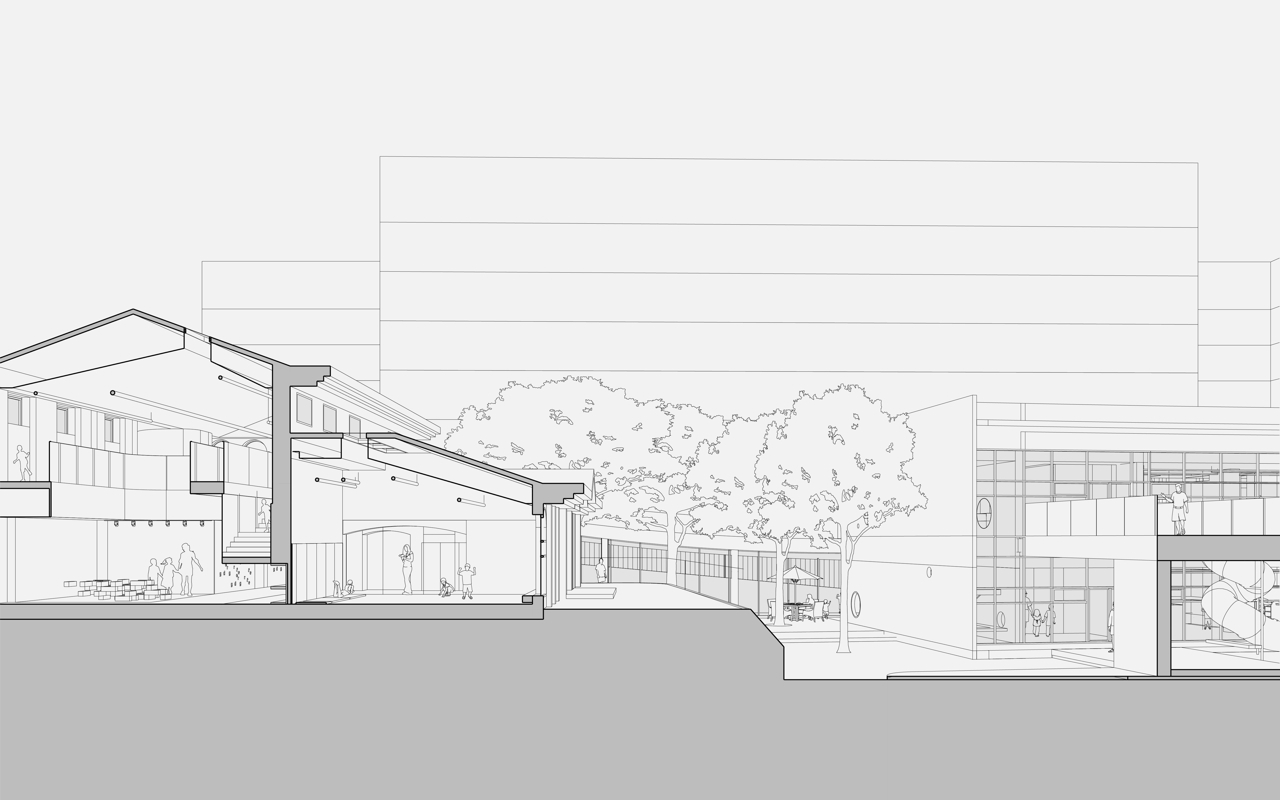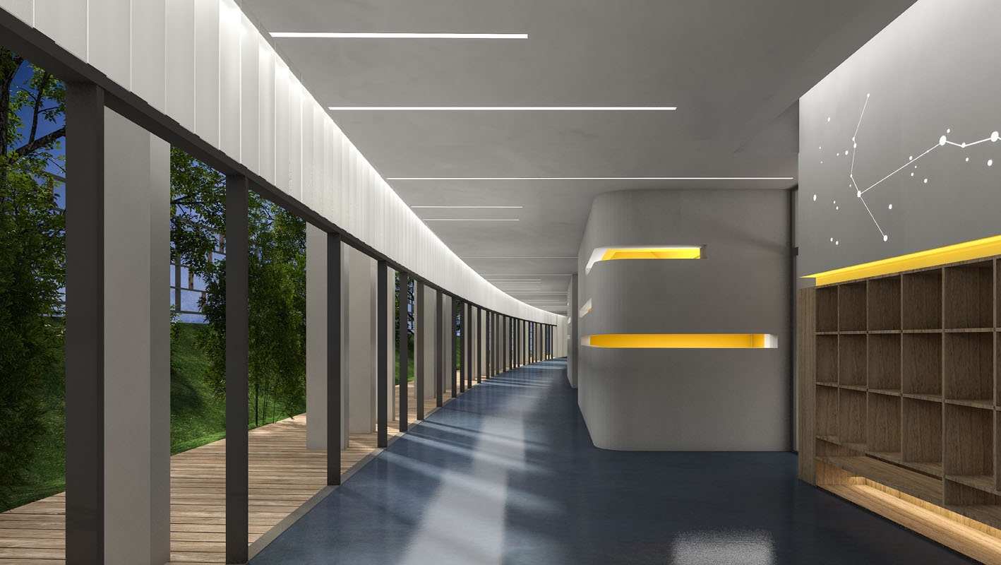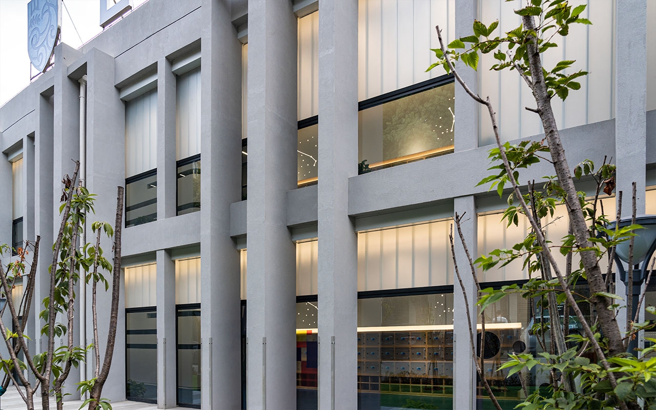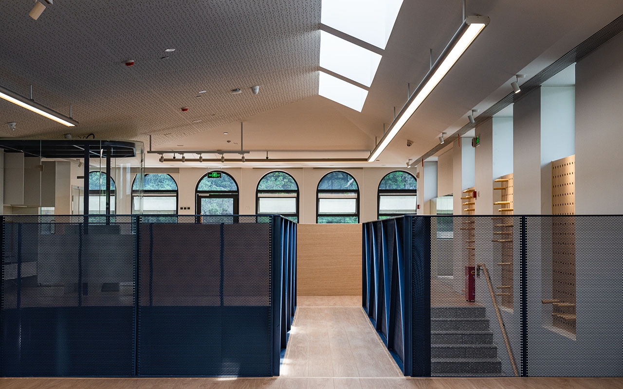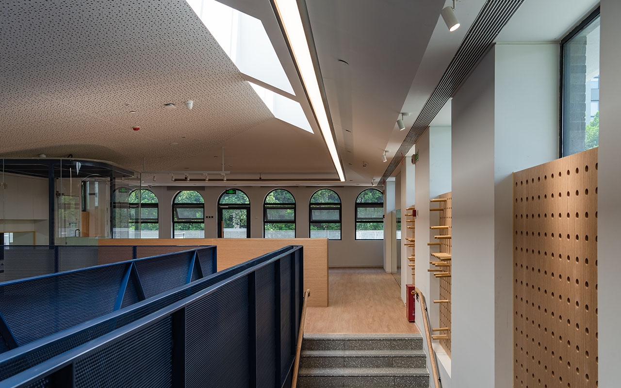 一号楼专注于功能教学,容纳音体教室/多功能剧场/烘焙/STEM科学课堂/绘本阅读等公共课室,也包括教研办公,厨房等配套服务设施。自然光借助屋顶增设的天窗,可以投射到公共功能课室空间的最里面。