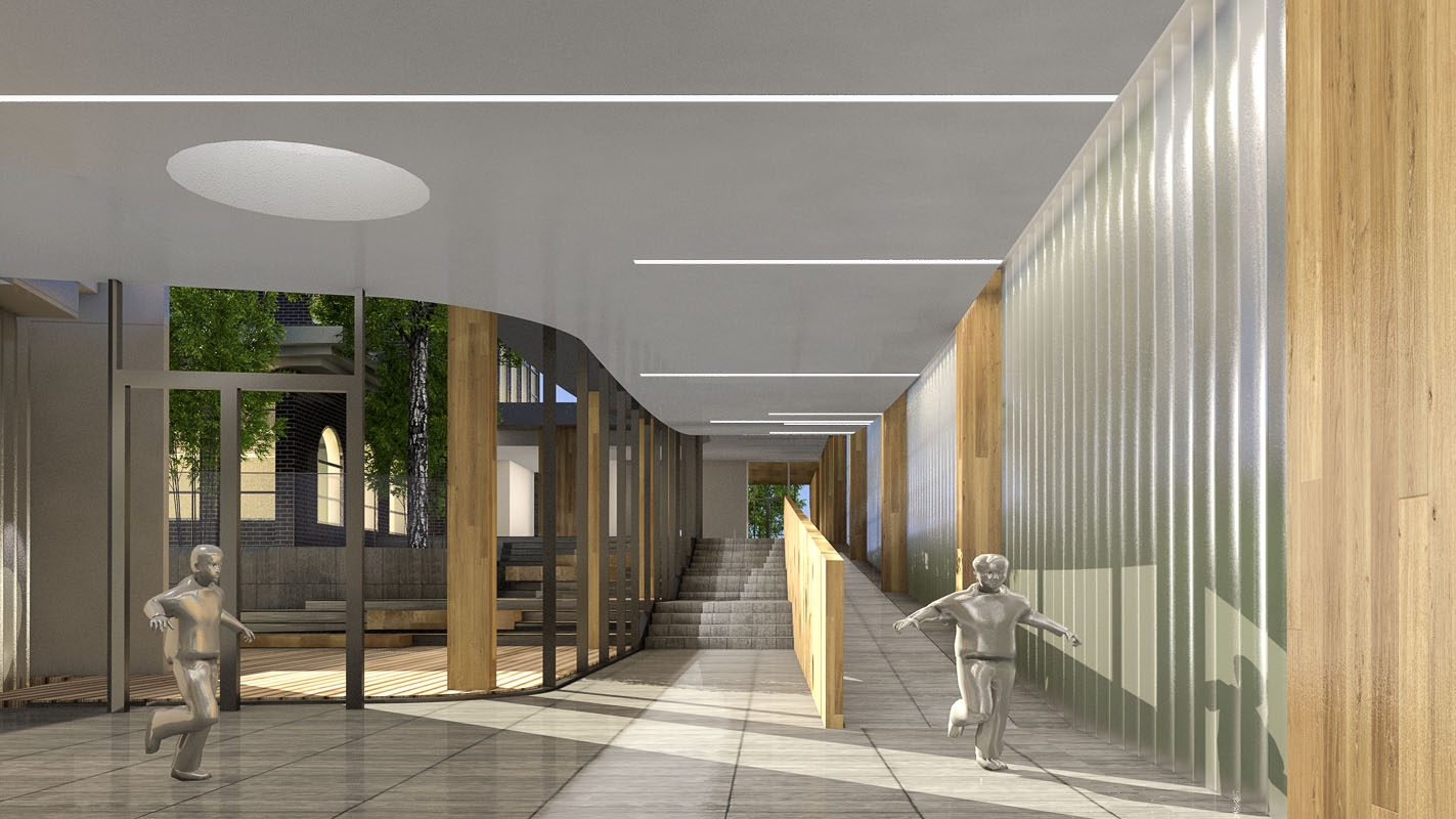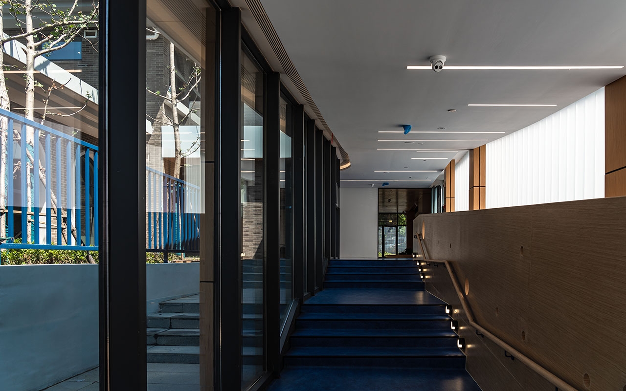 二号楼背侧朝向社区,紧邻道路及路边停车场地,立面设计相对封闭,透光的同时限定视野范围,将社区纷杂环境的干扰屏蔽在外。儿童生活单元洗手间与单面走廊之间的隔墙留有缝隙,视线穿过走廊可以看到外面庭院。