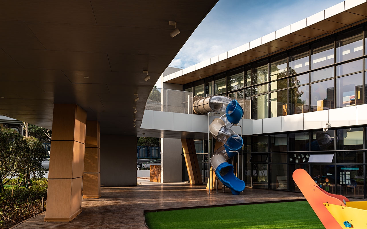 弧形的二号楼集中设置儿童生活单元,朝向户外庭院的一侧,采用落地大窗,鼓励室内外场地之间的互动,户外绿植景观与小朋友嬉戏玩耍的场景,全景展现在室内空间视野中。