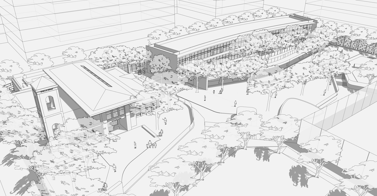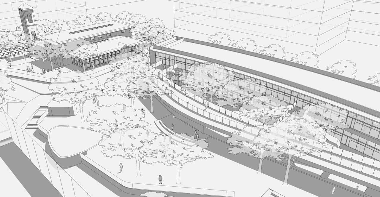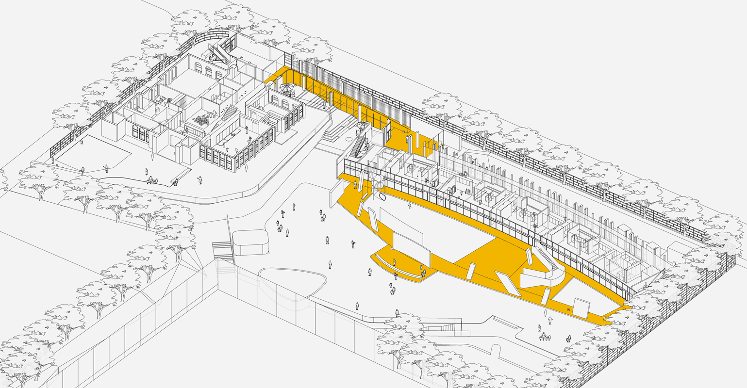 设计策略归结为穿针引线 铺路搭桥:通过连廊栈桥将原本孤立的建筑单体衔接在一起,与户外场地相互穿插缠绕,融合成互为图底的嵌套关系,为小朋友搭建出更多层级的空间,更多尺度转换的场景。
