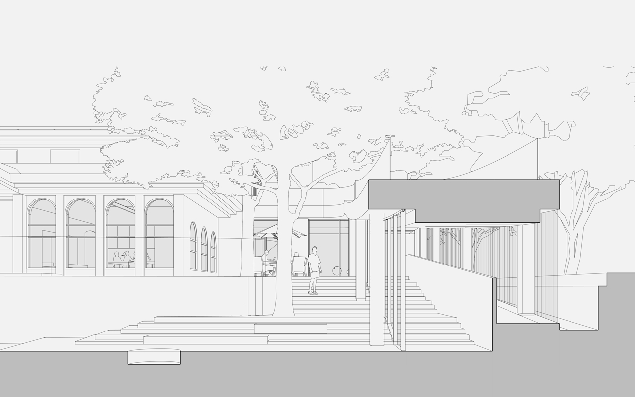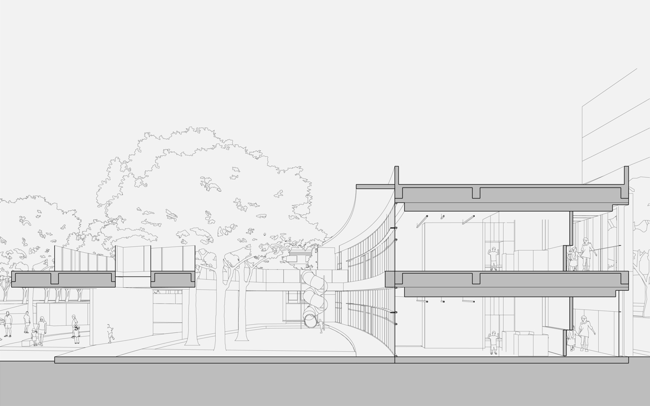一号楼与二号楼之间存在半层的地形高差,在连廊中平行设置踏步与坡道,为日常交通以及餐饮输送提供了稳定可靠的连接通道。连廊的屋顶则额外提供了一条户外的捷径,小朋友们可以沿着一条缓缓的弧线,直接飞奔到一号楼的功能课室。